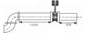 | 3.弯管的安装:如果流量计的前端有90°弯头或T型接头,要保证流量计的前直管段15米,后直管段5米 | ![]() | |||||||||||